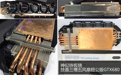 技嘉展出的這款三槽五風扇巨無霸非公版GTX680顯卡,其散熱體系十分奇特,采納5倍風之力,與顯卡核心程度方向出風,散熱效能堪比水冷。其強盛的散熱才能重要源于底部真空腔均熱板以及相銜接的9條熱管,足以勝任高達500W的TDP,GTX680就算超到爆也達不到這個瓦數。更多圖文報道:32相供電Z77!ComputeX技嘉展臺直擊