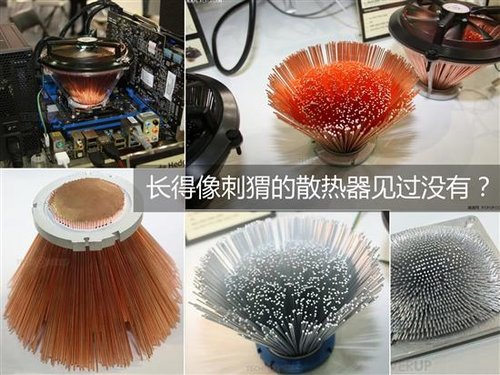 @卓克:假設一共500根銅絲,每根截面積10平方毫米,底面積大約50平方厘米,和大部疏散熱器底部面積差不多。每根長度12cm,這樣每根的表面積是13.4平方厘米,500根就是6700平方厘米的散熱面積;NH-D14鰭片總面積大約4200平方毫米。刺猬的散熱面積超過風冷王60%!更多圖文報道:散熱器學刺猬!臺北電腦展特異散熱器