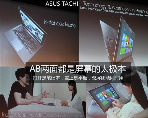 華碩在ComputeX上宣布重磅產品:“ASUS TAICHI ”。這款筆記本一改傳統變形原則,將ZENBOOK及平板直接合而為一,打開蓋進入筆記本模式,蓋上就是平板,一機雙重享受,更能完善實現多義務分享。華碩TAICHI太極這款機型擁有11.6英寸和13.3英寸兩種尺寸規格,采納Full HD1080p高分別率IPS面板,A面的屏幕同時支撐觸控操控。硬件上搭載最新Intel IVB架構處置器和SSD固態硬盤,正式上市時將搭載Win8體系,性能值得等待。更多圖文報道:筆記本平板合體!華碩TAICHI雙屏本圖賞